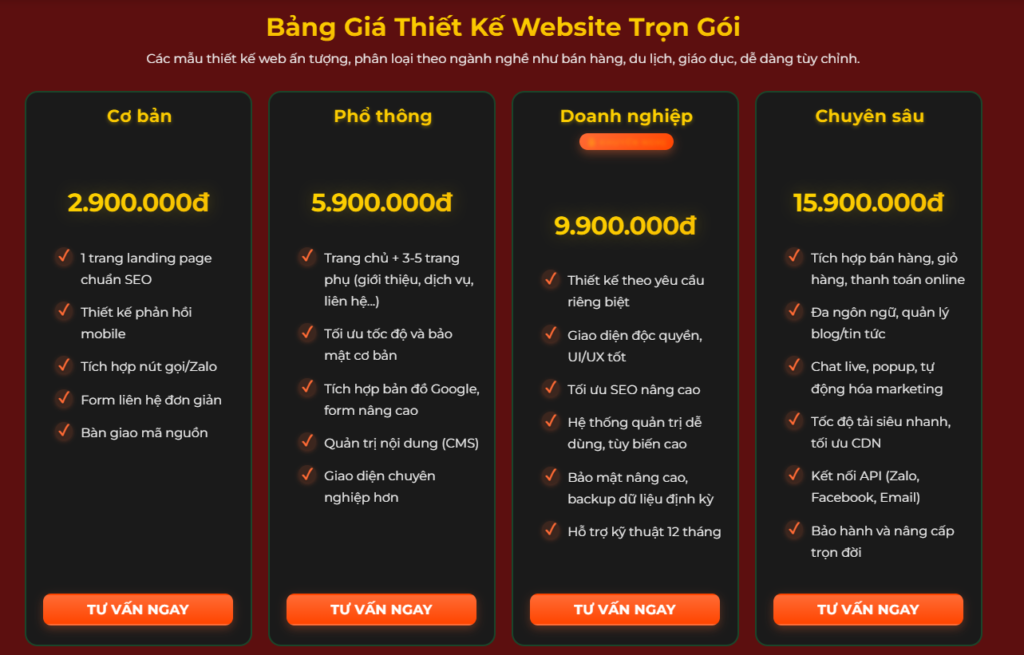 BẢNG GIÁ THIẾT KẾ WEBSITE CỦA VNNET